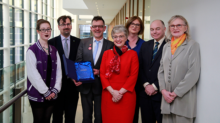 Minister Katherine Zappone TD congratulates Tonie Walsh on receiving the UCD LGBTQ+ Society Foy-Zappone Award