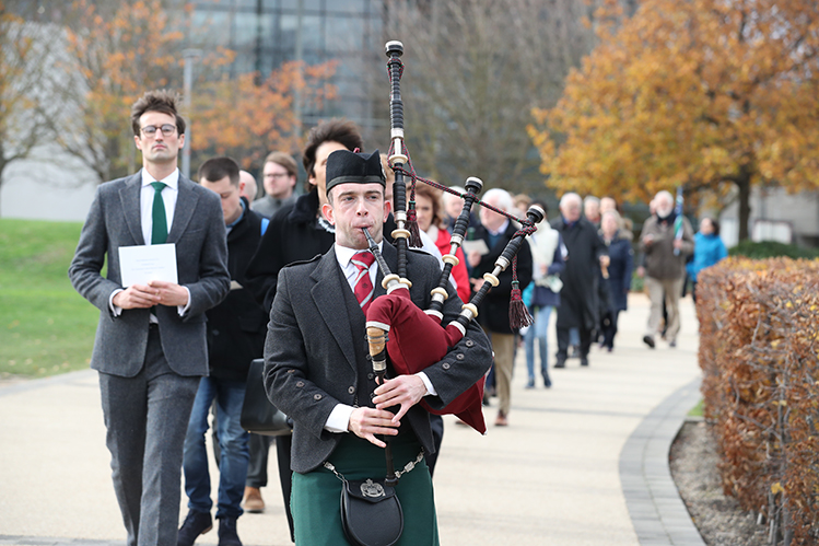 At 11 on the Friday before the Centenary of the Armistice for the First World War, relatives, staff and students, gathered at Memorial Hall, Richview, beside the plaque commemorating those from the former masonic school who went to World War One. Then, led by third year Music & English student and piper from St Laurence O’Toole pipe band, James Stone, the group walked the length of the campus, each person carrying a light and the name of the UCD students, staff and graduates who lost their lives across the battlefields of Europe between 1914 and 1918.