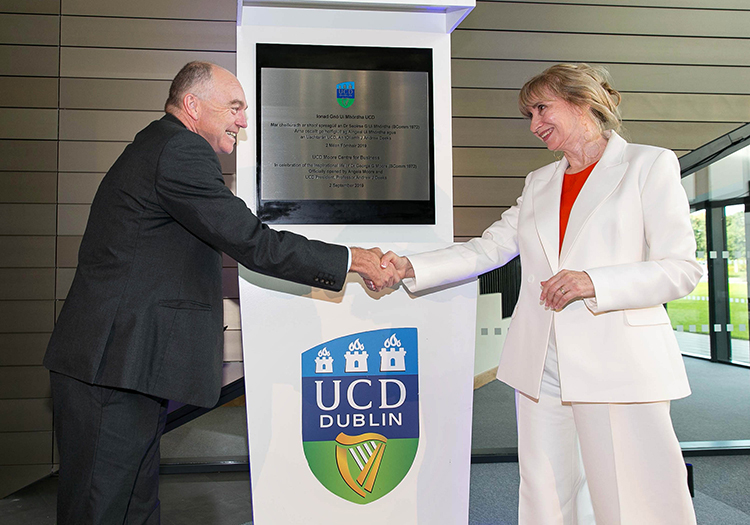 Designed by leading architecture firm RKD, the UCD Moore Centre for Business was opened by founding donor and business leader Angela Moore to honour the legacy of her late husband, entrepreneur, philanthropist and UCD alumnus Dr George G. Moore.
