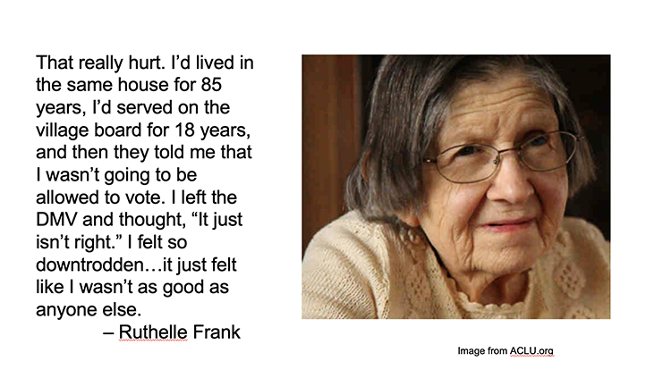 A slide from Professor Moynihan's lecture discussing the case of Ruthelle Frank, who voted in every US election since 1948 but who was never issued a birth certificate, testifiing about the burdens she faced to get a new ID