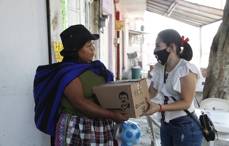 Food and supplies, labelled with the name and image of Mexican narco Joaquin ‘El Chapo’ Guzmán, is distributed during the coronavirus pandemic in Guadalajara. Francisco Guasco/EPA