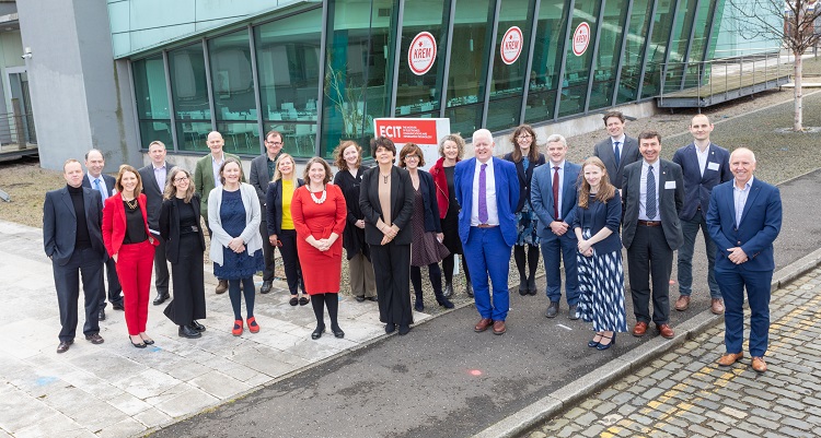 Research and innovation delegates from UCD and Queen's together at Queen's Institute of Electronics, Communications and Information Technology in Belfast for the signing of the historic MoU between the two universities