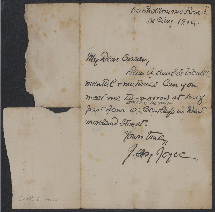 The private letter is one of two Joyce sent to his close friend and supporter C.P. Curran, both of whom graduated from University College Dublin in 1902, seeking help and an empathetic ear during his plight as a writer.
