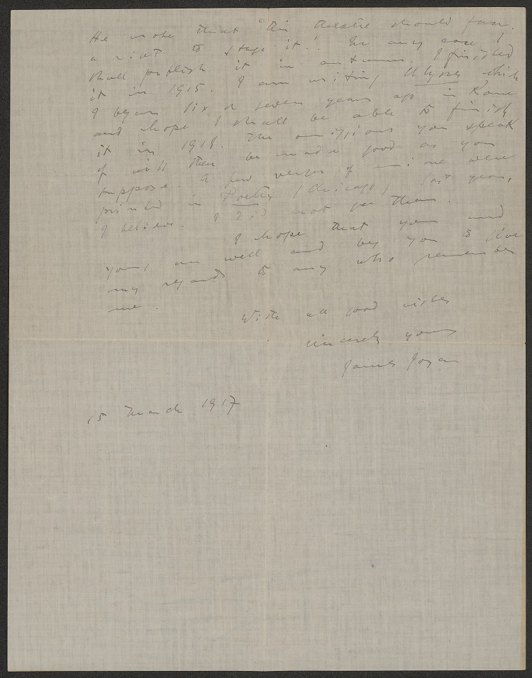 In the second private letter written by Joyce to Curran in 1917 while he was in Zurich working on Ulysses, the writer describes how he is “recovering from a painful — and this time dangerous — illness of the eyes…”