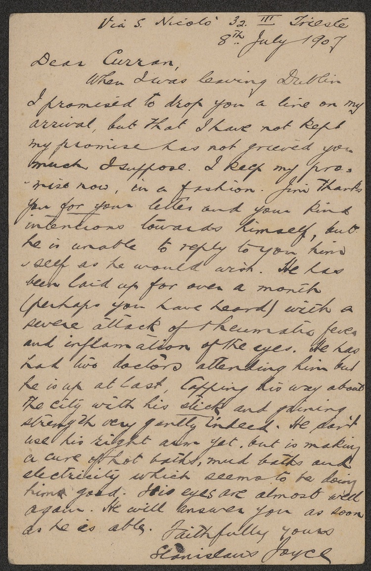 A postcard written by Joyce’s younger brother, Stanislaus Joyce to C.P. Curran in 1907 to tell of the great writer’s “severe attack of rheumatic fever and inflammation of the eyes” has also been acquired by the University.