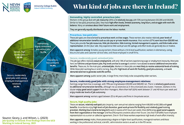 Carried out by (opens in a new window)Professor John Geary, from the UCD College of Business, and Lisa Wilson, NERI Senior Economist, the analysis broke down employment in Ireland into five job types, and showed that almost 15% of jobs were precarious in nature and provided low earnings.