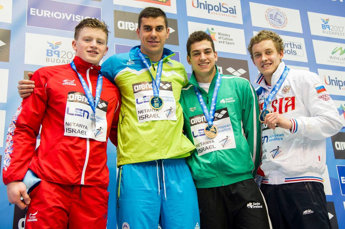 Pictured top: Alex Murphy, third from left, who won the bronze medal at the LEN European Short Course Swimming Championships in Netanya, Israel, on the championship podium along with (from left to right) Adam Peaty, Damir Dugonjic and Oleg Costin (far right), who also picked up medals at the championships; and above footage of Murphy in action in the 50m Breaststroke final