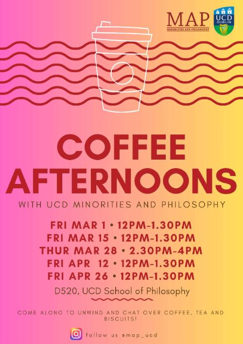 The Coffee and Tea (CAT) Afternoons are an opportunity for philosophy students from all levels (postgrads or undergrads) as well as staff, to socially meet and chat over coffee and tea, think about event ideas, share issues or concerns, or just meet and interact with new people (as well as old ones), in a safe space and with a friendly community. This semester, the CAT Afternoons are held every Friday at 1PM at the Agnes Cumming Seminar Room at the School of Philosophy. All philosophy enthusiasts are welcome.Philosophy & Literature Symposium | 8 October 2021 | Join PhD students from UCD School of Philosophy and the University of Augsburg for a symposium exploring ethical themes and intersections between philosophy and literature