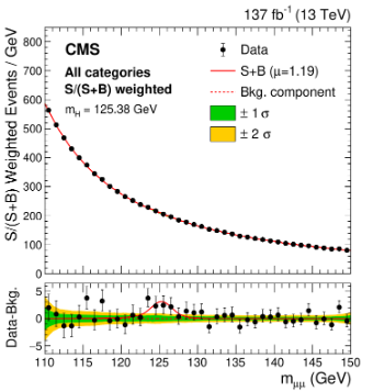 FIG. 1: Event in which a candidate Higgs boson produced in association with a Z boson (ZH) decays into a pair of muons, indicated by the solid red lines FIG. 2: The di-muon invariant mass distribution for a weighted combination of all event categories. The lower panel shows the residuals after background subtraction with the best-fit signal contribution indicated by the red line.
