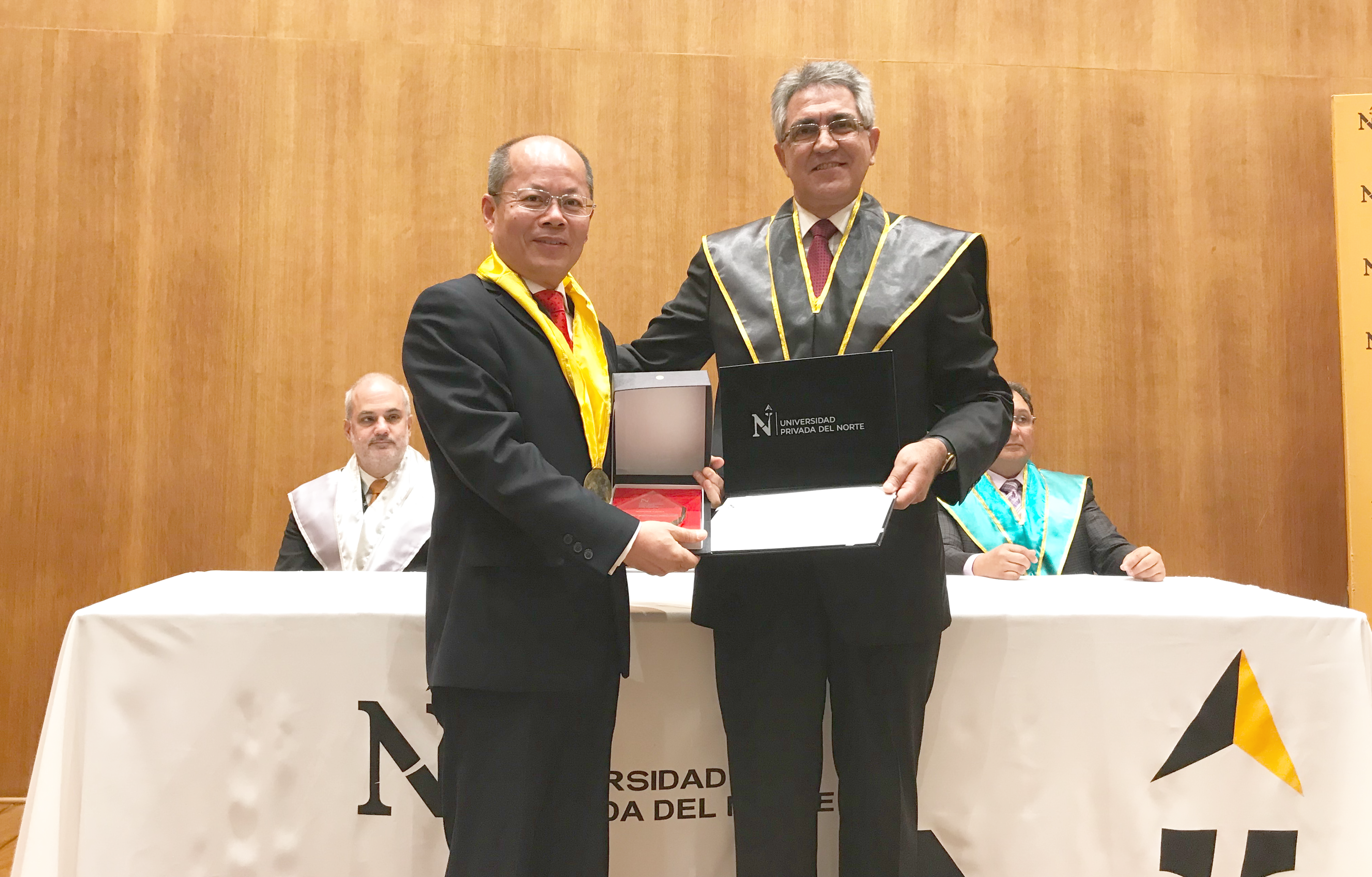 In 2018, Dr. Andrés Velarde, the Rector of UPN, presented Professor Da-Wen Sun with the certificate, medal, and plaque for the honorary doctorate (Honoris Causa) of Universidad Privada del Norte (UPN)