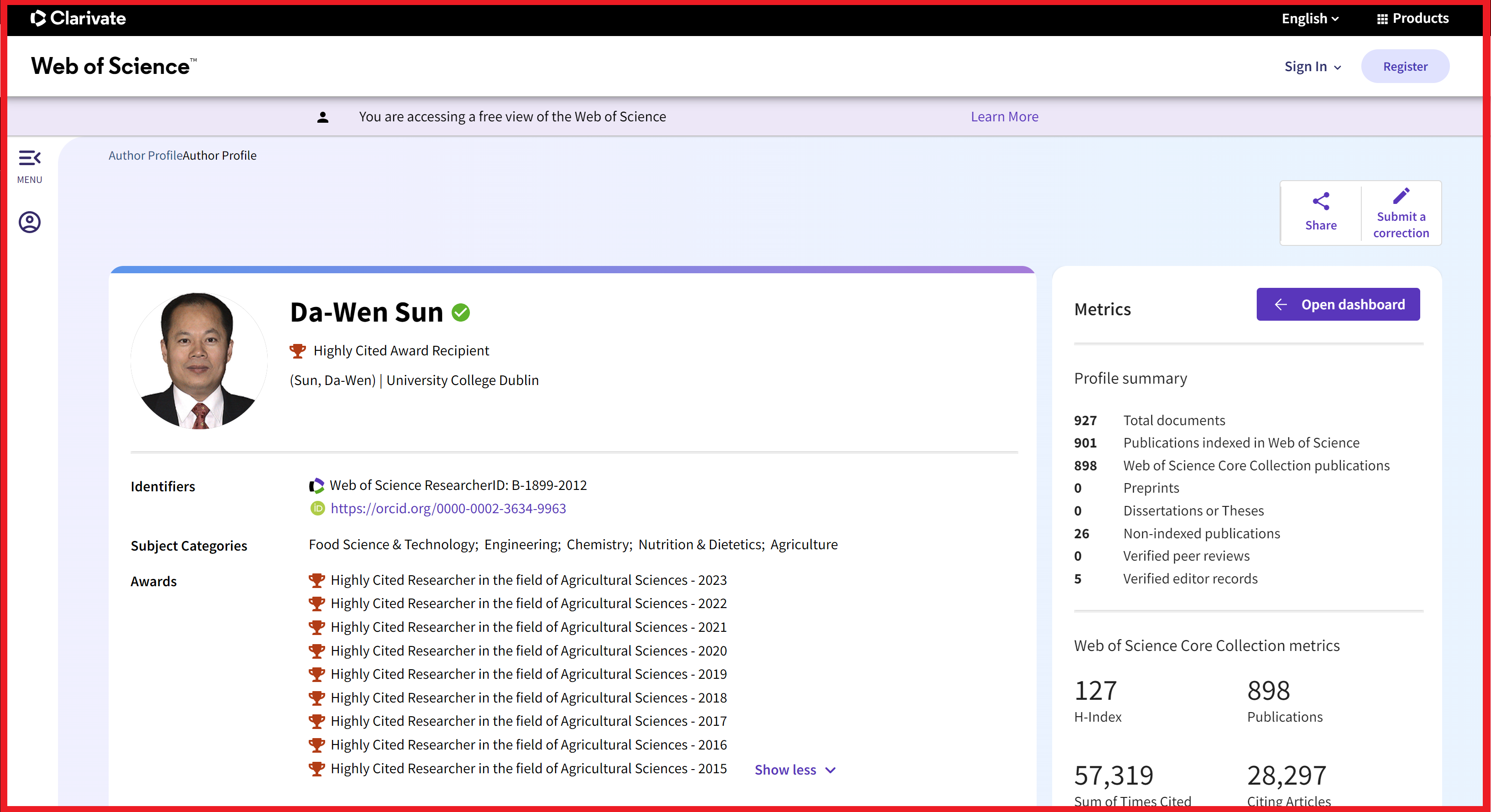 - A Milestone — Professor Da-Wen Sun’s H-Index (Web of Science) Reaches 100
