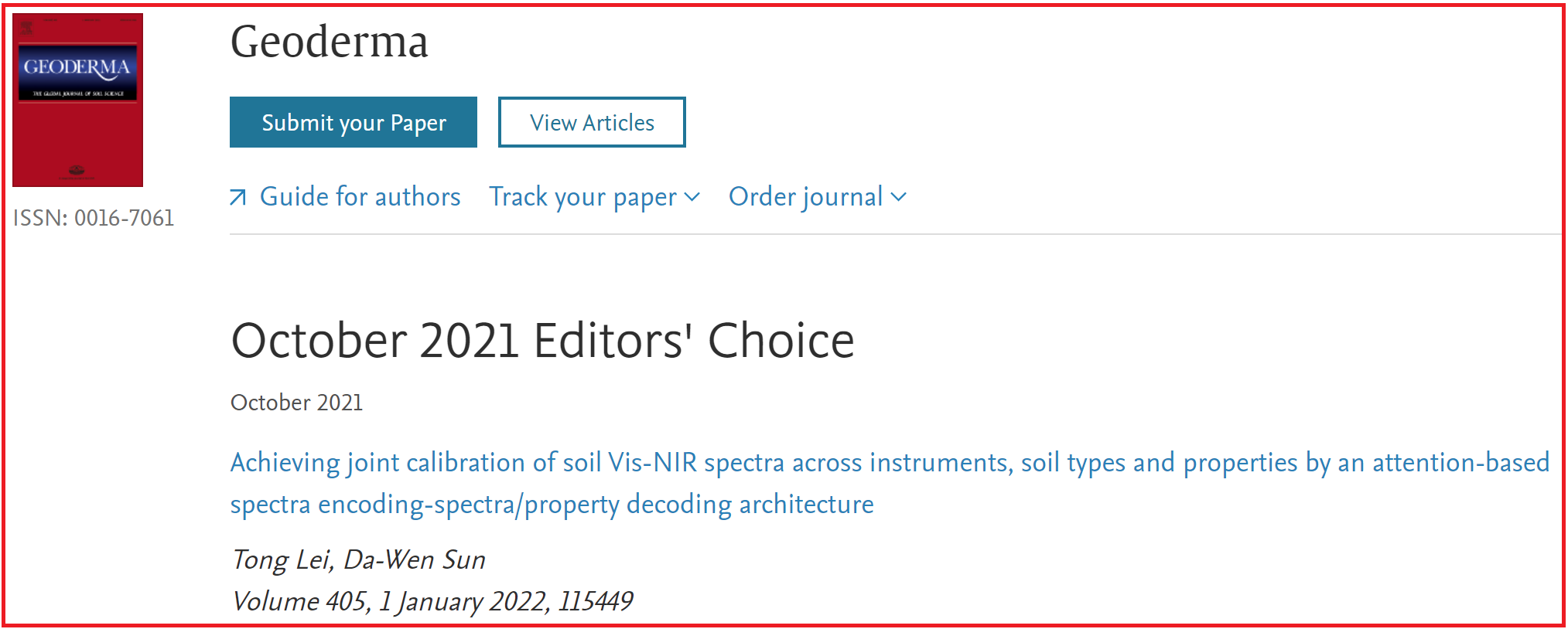 A research paper entitled “(opens in a new window)Achieving joint calibration of soil Vis-NIR spectra across instruments, soil types and properties by an attention-based spectra encoding-spectra/property decoding architecture” by PhD Student Lei Tong and his supervisor Professor Da-Wen Sun, which was published in Geoderma (Volume 405, 1 January 2022, 115449), has been selected as “Editors’ Choice” article for October 2021. Geoderma is a top journal in soil science, which ranks 3rd position among the 37 journals in the soil science category in the Web of Science SCIE edition, with a 2020 impact factor of 6.115.