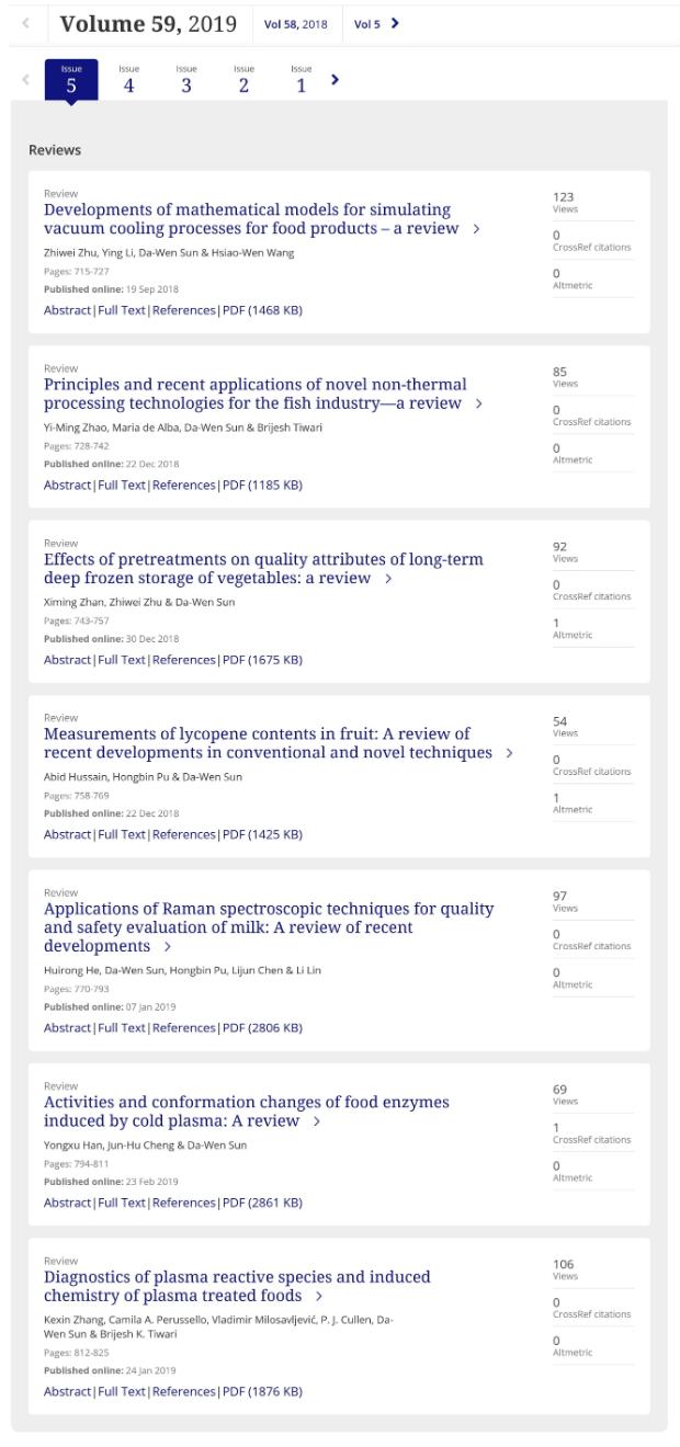 Seven Review Papers by Professor Da-Wen Sun Published in Issue 5 of Critical Reviews in Food Science and Nutrition