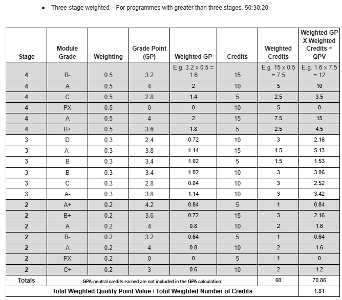 You should be aware that UCD discourages the accumulation of additional credit above a programme's requirements for Stage and Award GPA. As such, Assessment will not facilitate queries regarding the Stage and Award GPA calculations where a student may accumulate additional credit.