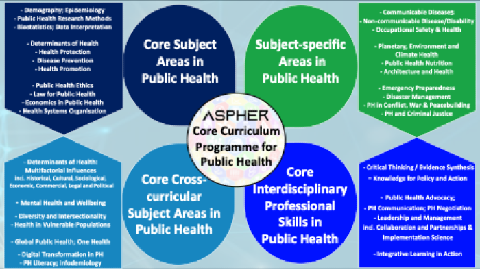 In developing the ASPHER Core Curriculum for Public Health, an extensive scoping and consultative process resulted in 35 subject areas collated into four domains: core subject areas (essential in all programmes of public health); subject-specific areas (largely determined by contemporary challenges); core cross-curricular subject areas (applicable across programmes integrated with core and subject-specific areas); and core interdisciplinary professional skills, those desirable skills of Public Health Professionals.