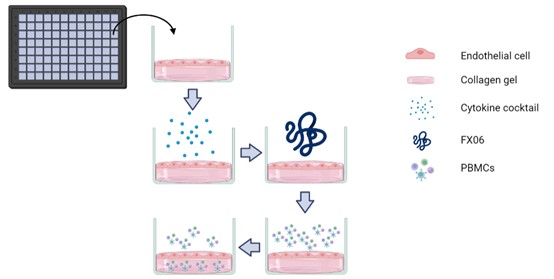 Transendothelial Migration (TEM) Assay enables the investigation of functional changes in the endothelium. More immune cells travel through the endothelium reflecting the increased permeability of the endothelium. I would like to reveal if FX06 can help return the permeability of endothelium damaged by cytokine storm to normal. To check if FX06 is effective, we would need to see a reduction in the number of immune cells that migrate through the endothelium.