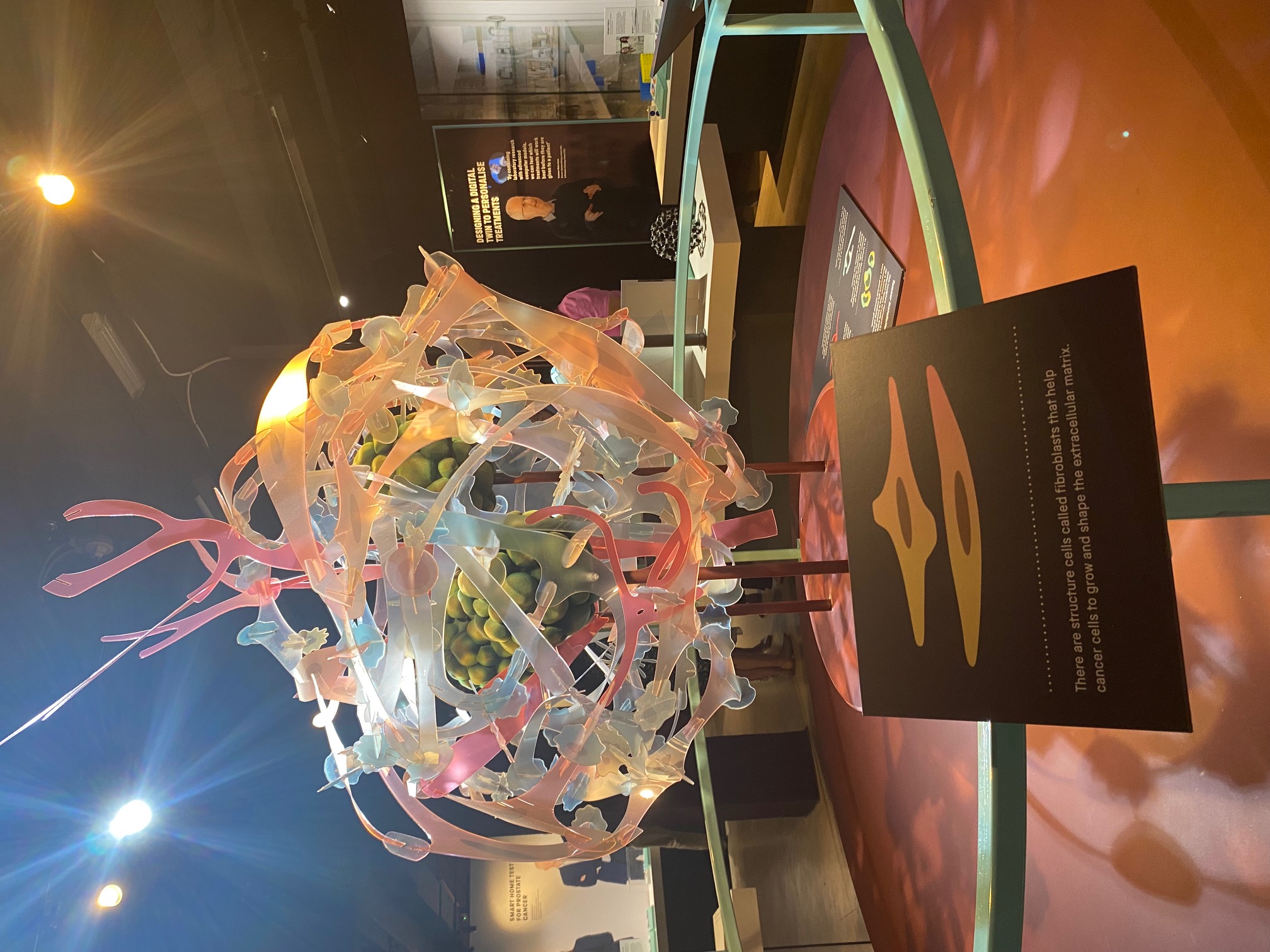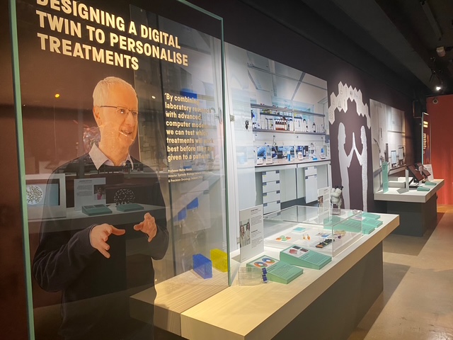 The SBI/POI display is built around the concept of digital twins and the way in which researchers are using cutting edge analytics to bring personalised treatment and diagnostics to the clinic, making meaningful strides towards better cancer care and improved outcomes for patients. The display is positioned near the exhibit’s iconic sculpture of a tumour.