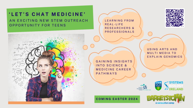 [UNIVERSITY COLLEGE DUBLIN, 1 JANUARY 2024]: Systems Biology Ireland at UCD has launched Let’s Chat Medicine (LCM), a new public engagement and involvement (PEI) initiative in the health-related research area, working in collaboration with Barretstown and the Young Person’s Advisory Group at the National Children’s Cancer Service. The overall objective of the LCM programme is to bring young members of the public together with STEM researchers, artists and a broad spectrum of professionals to work inclusively and in partnership towards a common goal of enhancing public understanding of personalised medicine.