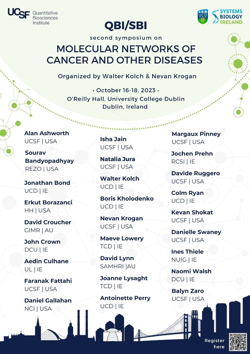 The teams at Systems Biology Ireland (SBI) and the Quantitative Bioscience Institute (QBI) at the University of California, San Francisco, are delighted to announce the 2nd QBI/SBI Symposium on Molecular Networks of Cancer & Other Diseases, to be held in person at University College Dublin from 16 – 18 October, 2023. Organised by Prof. Walter Kolch (SBI) and Prof. Nevan Krogan (QBI), this free meeting is designed for the health-related research community to explore new collaborations and funding opportunities between the US and Ireland.