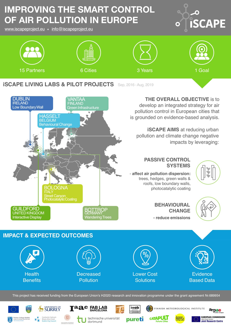 The iSCAPE project works on integrating and advancing the control of air quality and carbon emissions in European cities in the context of climate change through the development of sustainable and passive air pollution remediation strategies, policy interventions and behavioural change initiatives.