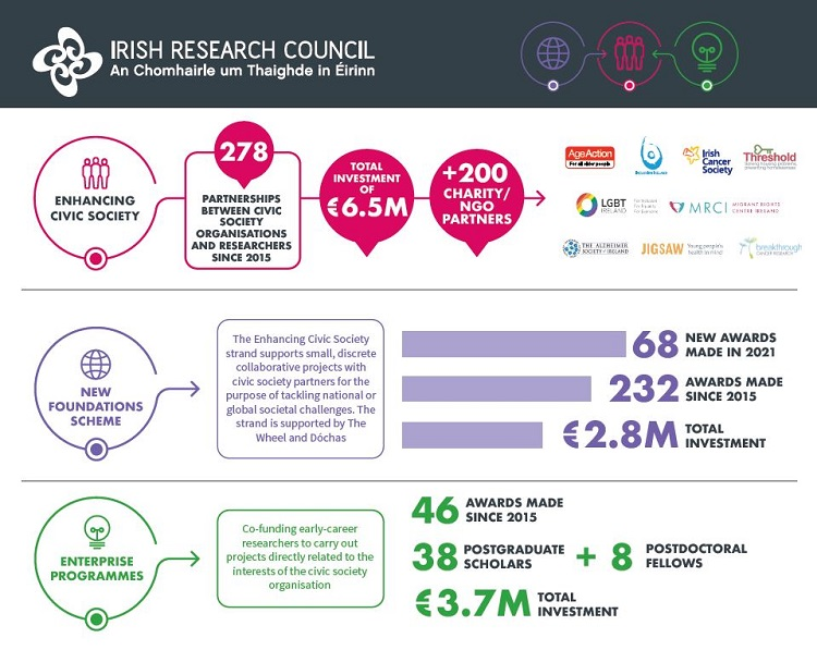 Since 2015, over 200 community, voluntary and charity organisations have engaged across various Irish Research Council programmes, 278 projects have been funded with an associated investment in excess of €6.5 million.