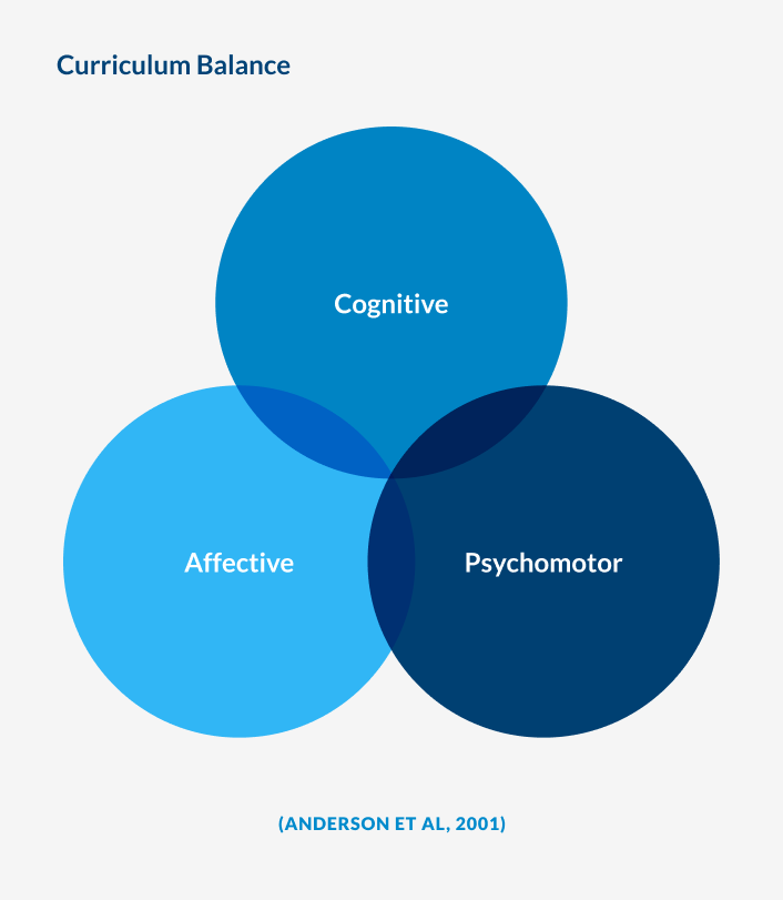 Consider in your Programme Outcomes a balance between cognitive, affective and psychomotor outcomes (Anderson, 2001). Another way of looking at this is a balance between areas in the curriculum that are related to knowledge, action and self (Barnett & Coates, 2005b).