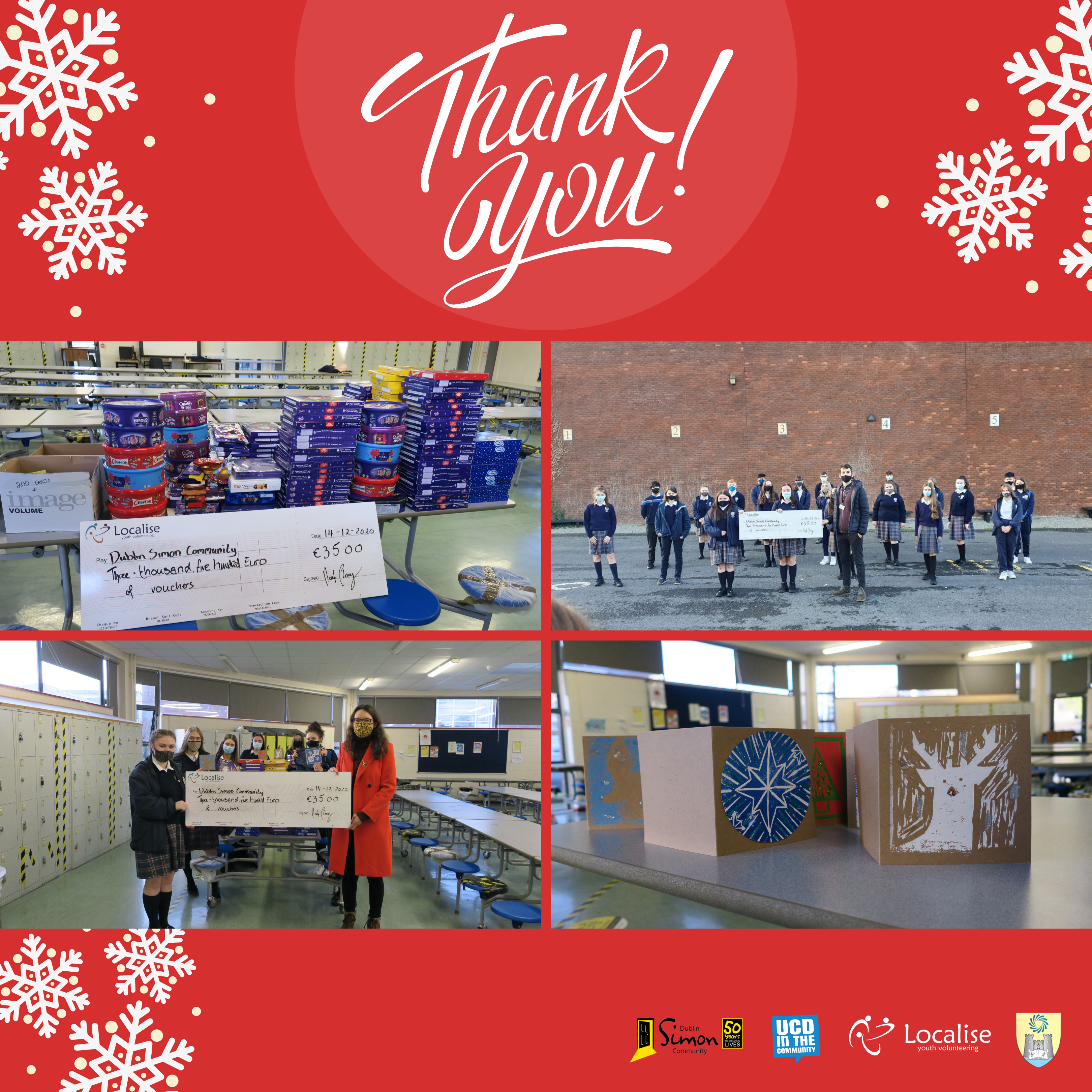 Every year, UCD, in collaboration with (opens in a new window)Localise and (opens in a new window)Presentation Community College Terenure organise a care package appeal for the rough sleepers of (opens in a new window)Dublin Simon Community. In 2020, due to the Covid-19 pandemic, the usual appeal was not possible. The wonderful Transition Year students in Terenure Presentation Community College undertaking their Localise volunteering programme still wanted to do something to help. Taking the lead from the rough sleepers team of Dublin Simon Community, the suggestion was that people can donate vouchers to people experiencing homelessness this Christmas. We were blown away by the response from the UCD community and the staff and students of Presentation Community College. Over €3500 worth of vouchers were donated to the Dublin Simon Community rough sleepers team, and will be given to people experiencing homelessness this Christmas. A huge thank you to everyone who donated a voucher, your support and generosity is so very much appreciated.