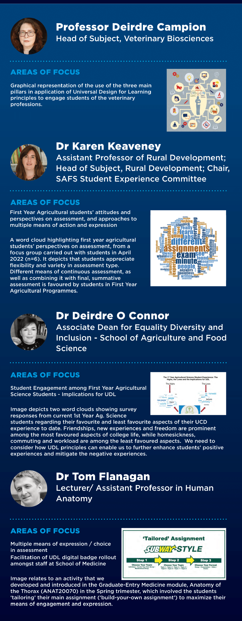 Tom joined the UCD School of Medicine in 2008 as Lecturer/Assistant Professor in Human Anatomy and leads the Tissue Engineering Research Group at the School. Tom’s teaching focuses primarily on the topics of neuroanatomy, cardiovascular anatomy and histology, and he is motivated by the challenge of explaining difficult concepts to students using creative strategies underpinned by imagination, invention and innovation. Tom has been consistently acknowledged as an effective educator with several awards, including the UCD Medicine Pre-Clinical Teacher of the Year Award (2015, 2016). Always striving to enhance his teaching to benefit all of his students, he has completed the Professional Diploma in University Teaching & Learning at UCD, and is currently completing the Professional Diploma in Creativity and Innovation for Education (UCD Innovation Academy). Alongside his passion for teaching and for seeing his students succeed, Tom is focused on addressing disability awareness and inclusivity through his roles as Disability lead on the School of Medicine EDI Committee, and on both the Disability and Neurodiversity Working Groups of the College of Health & Agricultural Science EDI Committee. As a University for All Faculty Partner, Tom hopes to combine his passions for teaching and inclusivity by developing universal design for learning (UDL) strategies in his own practice, and also influencing the practice of his colleagues, in order to maximise the potential of our diverse student population.