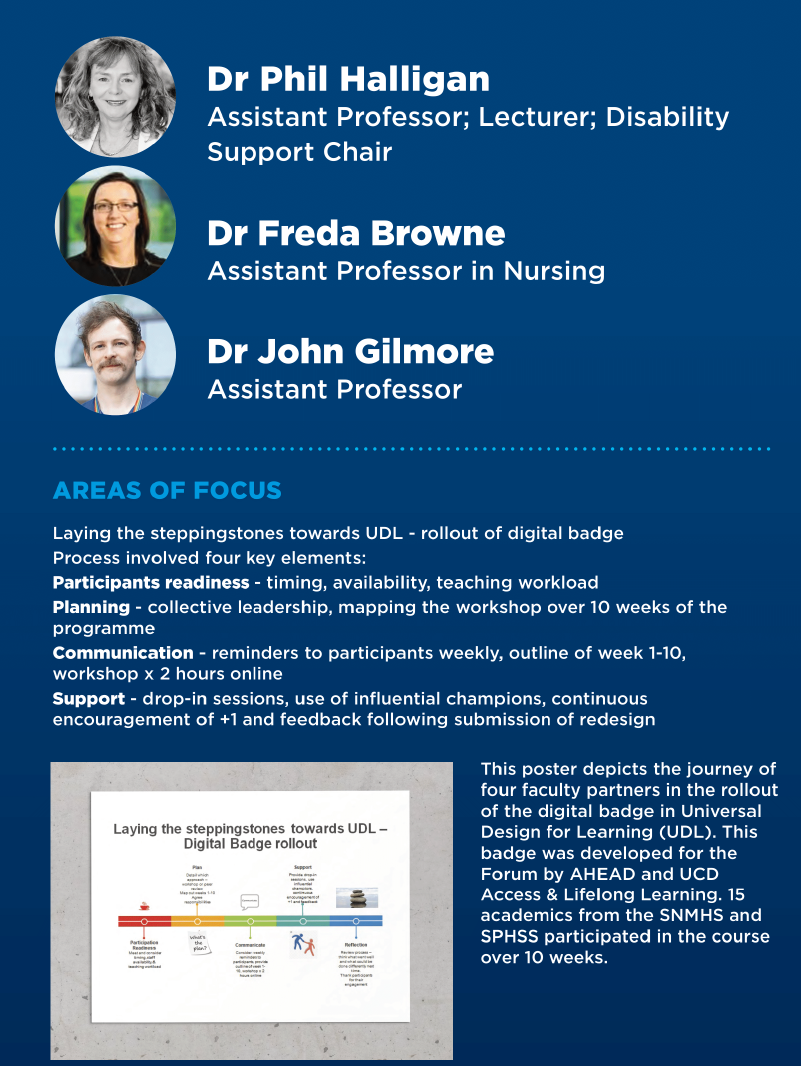 Freda is an Assistant Professor in the School of Nursing Midwifery and Health Systems and teaches across undergraduate and postgraduate nursing and midwifery programmes. Freda has over 13 years of experience in nurse education in both clinical education and higher education settings. Her research interests are in scholarship of teaching and learning, which is reflected in her teaching practice and publications. She has completed the UDL Digital Badge and Facilitators Badge in 2020, and in 2021 has supported a roll out of the Digital Badge across UCD. Since completion of the UDL Badge, she has been embedding the principles of UDL across the modules on which she teaches. She will be supporting the October National UDL Digital Badge roll out as a Peer Facilitator.
