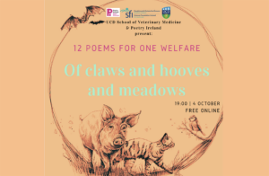 With support from the Science Foundation Ireland Discover Programme, Professor Alison Hanlon from the UCD School of Veterinary Medicine and Poetry Ireland were delighted to present the online launch of Of Claws and Hooves and Meadows: 12 poems for One Welfare on World Animal Day (4 October). One Welfare recognises the interconnection between the well-being of humans, animals and the environment. The event featured four newly commissioned poems each on a One Welfare theme: Caged, Kinship, Wildlife and Beloved. The poets were introduced by scientists from UCD and Queens University Belfast working in animal welfare, to create a bridge between poetry and science.